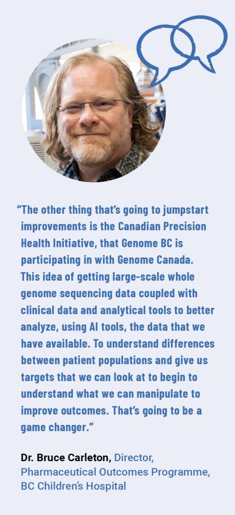The impact has been significant. When the project began, fewer than 10% of all pediatric cancer patients in Canada were being tested. By its final year, 60% of all pediatric cancer patients in Canada were receiving pharmacogenomic testing to help guide their care.